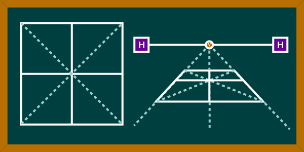 - Subdivide the square by drawing a line fron corner to corner, then repeat this process with the opposite two corners. The point where the diagonal lines intersect will be the center of the square in perspective. The center should appear to be closer to the back edge than the front because size diminishes as things get further away from the viewer.